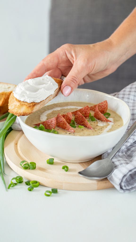 2. Salami podsmaż na chrupiąco na suchej patelni. Bagietkę opiecz w tosterze. Śmietankę 30% wymieszaj w miseczce z 20 g serka Philadelphia Light i udekoruj zupę. Tak przygotowaną cebulową podawaj posypaną świeżym szczypiorkiem i salami, z kromkami bagietki posmarowanymi pozostałym serkiem Philadelphia Light.