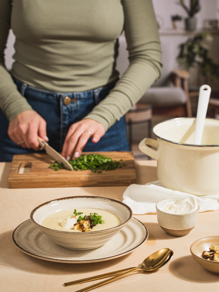 Zupę podawaj z łyżeczką serka na wierzchu, posypaną chipsami z topinamburu i szczypiorkiem.