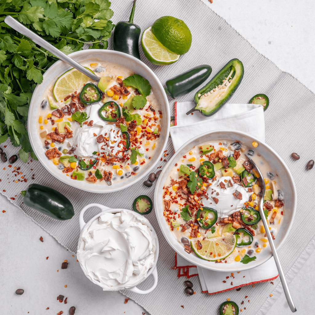 Gotuj na małym ogniu przez 10 minut, a następnie dodaj serek Philadelphia Original, dokładnie wymieszaj i zdejmij garnek z palnika. Pokrój awokado w kostkę, posiekaj kolendrę i dodaj do zupy. Przelej zupę meksykańską do misek i posyp chrupiącym bekonem oraz krążkami jalapeño. Udekoruj plastrami limonki.