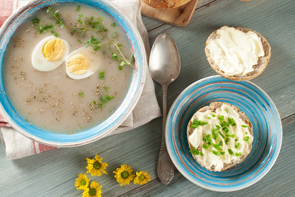 Podgrzej żurek. Podawaj z jajkiem oraz bułką z chrzanowym serkiem. Udekoruj ziołowym pieprzem i szczypiorkiem oraz świeżym majerankiem.